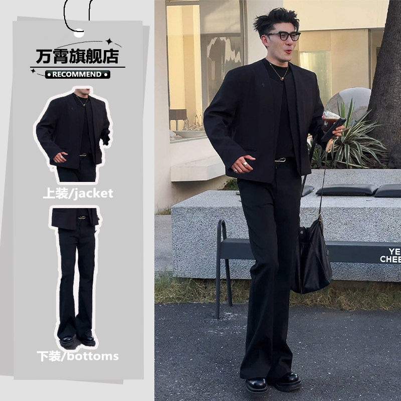 Men's casual suit autumn ruffian handsome high-end deconstruction short collarless straight shoulder suit jacket with a complete set