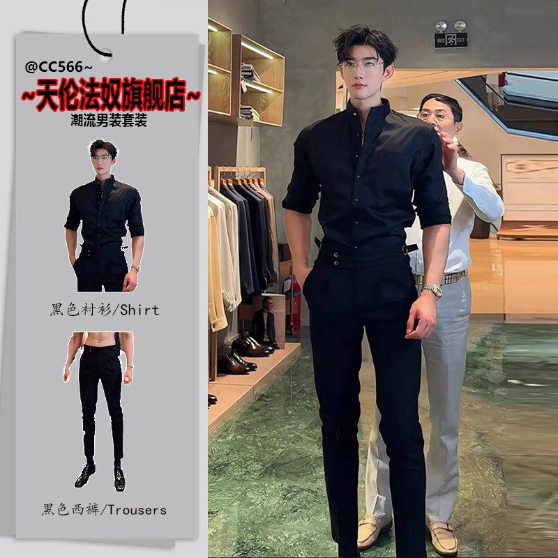 British yuppie men's black shirt with double belt slim trousers autumn outfit with a complete set of high-end feeling