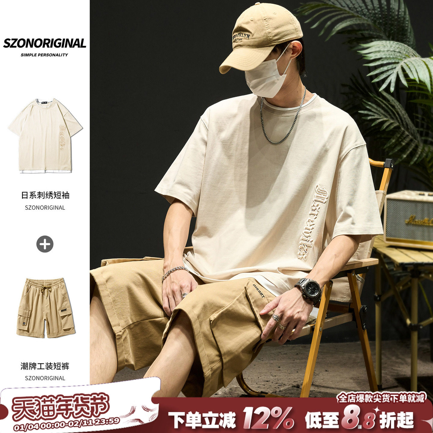 The set of men's summer Japanese trendy brand pure cotton is versatile, a complete set of 2025 new embroidered short-sleeved American cargo shorts