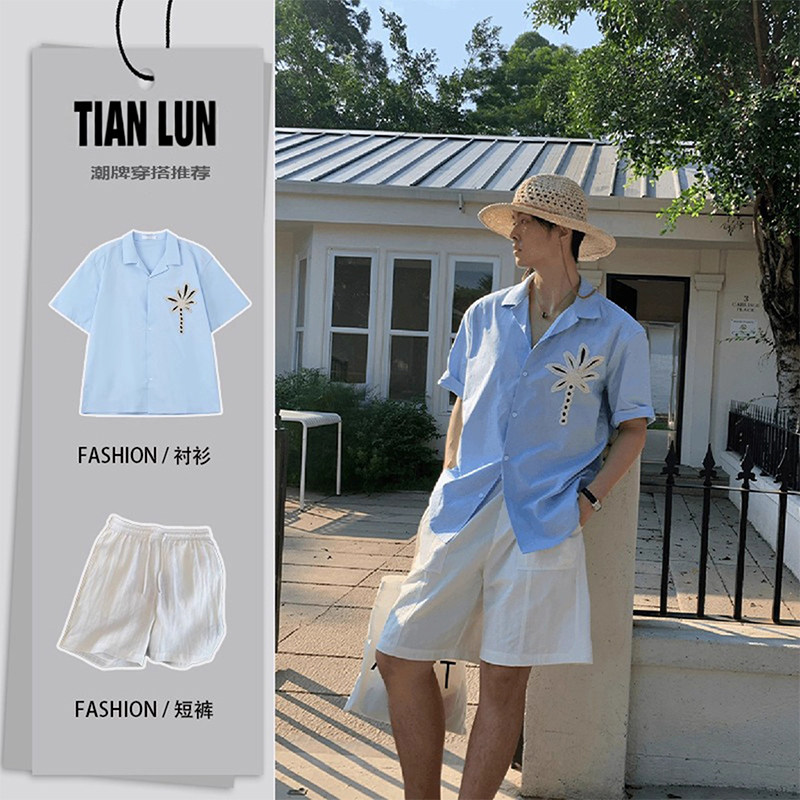 Sky blue coconut tree hand-embroidered shirt short-sleeved shorts suit men's summer 2025 popular outfit