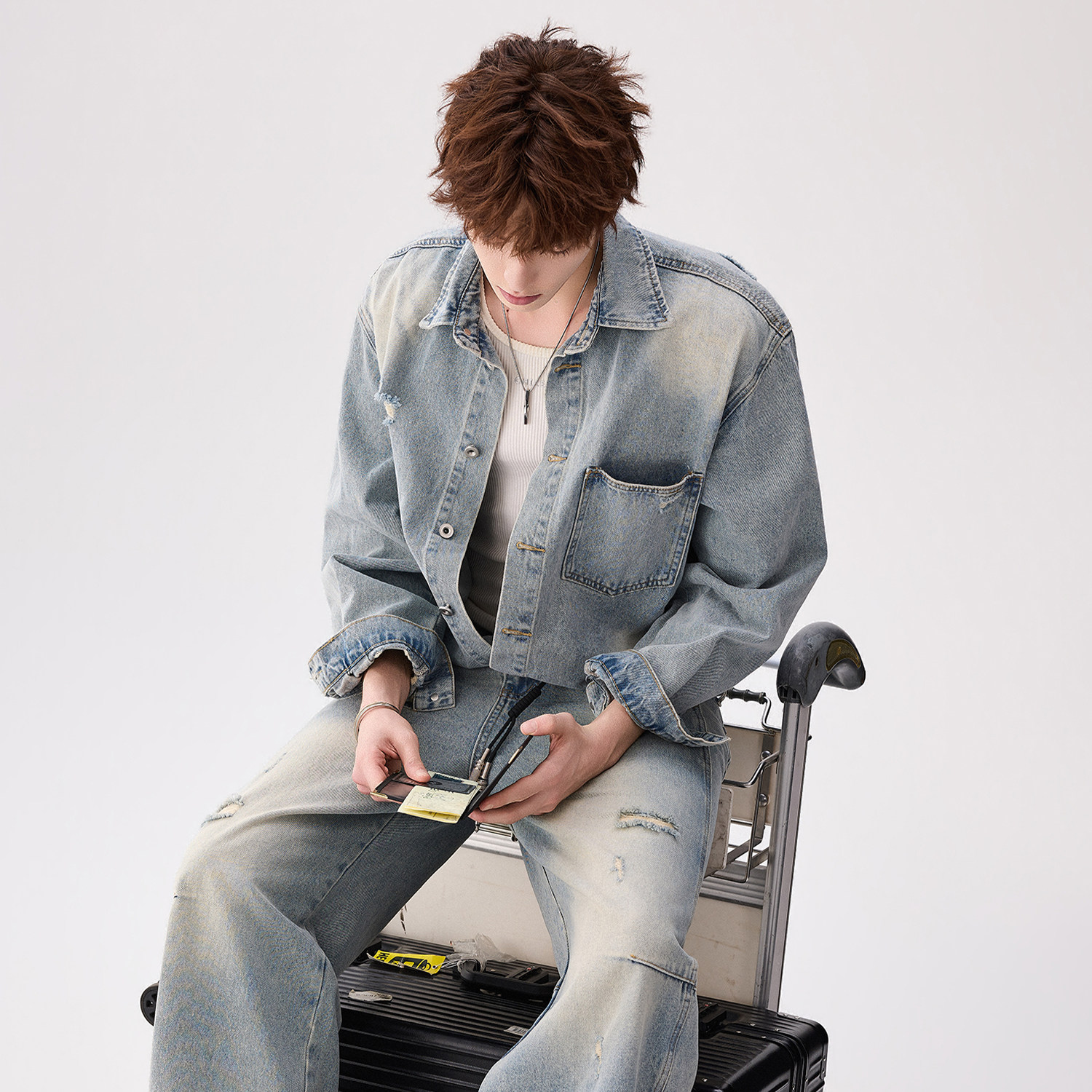 LINYILUCK/niche waste soil tie-dye hole design shoulder pad denim jacket jacket men's high-end suit trend