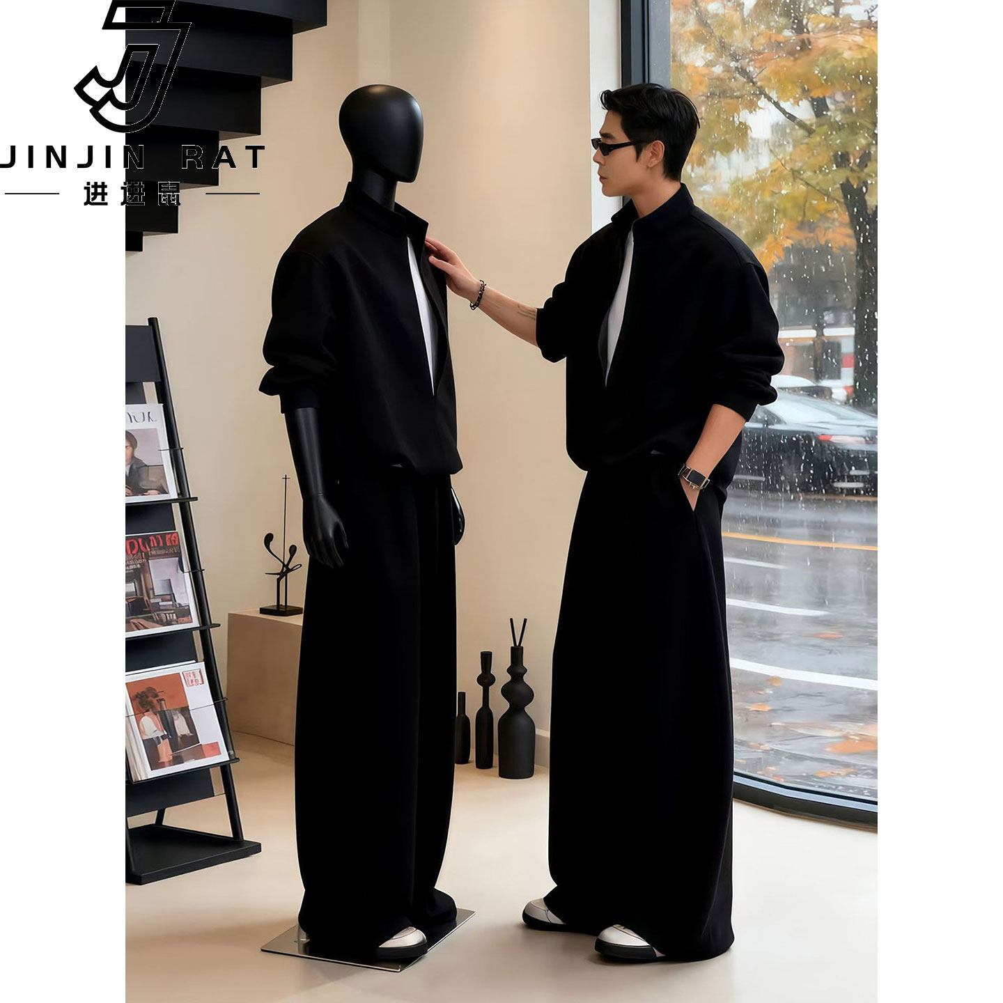 Black fake two-piece V-neck sweatshirt men's autumn and winter high-end ruffian handsome wears a complete set of British-style wide-leg sweatpants