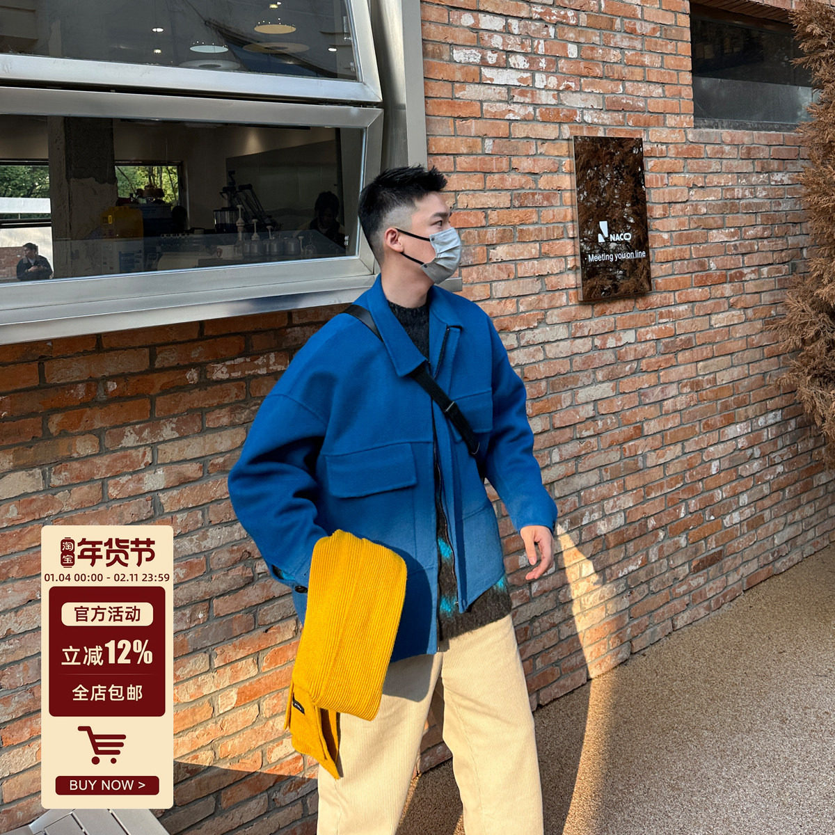 Klein blue wool reversible vintage cargo woolen jacket coat men's winter cropped loose woolen coat