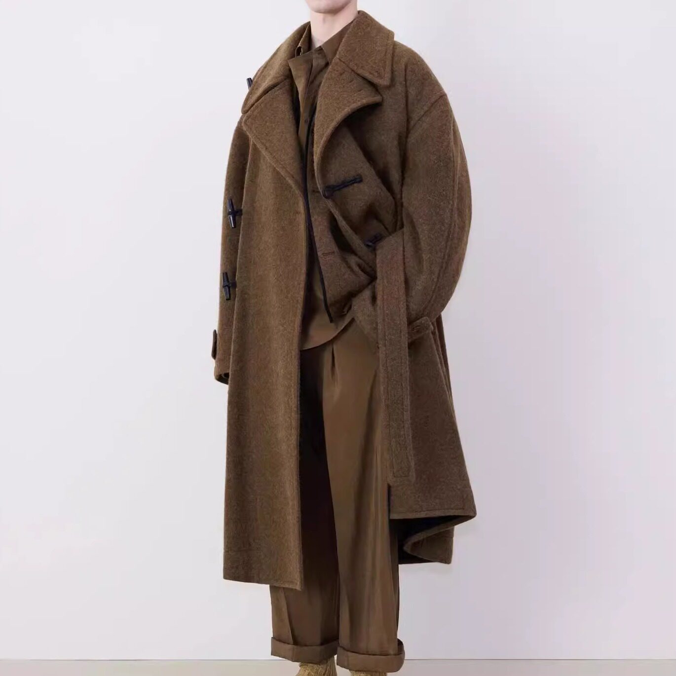 Spring Seconds LEMa*i~ Asymmetrical horn button coat for men 24 autumn and winter brown alpaca belt long coat