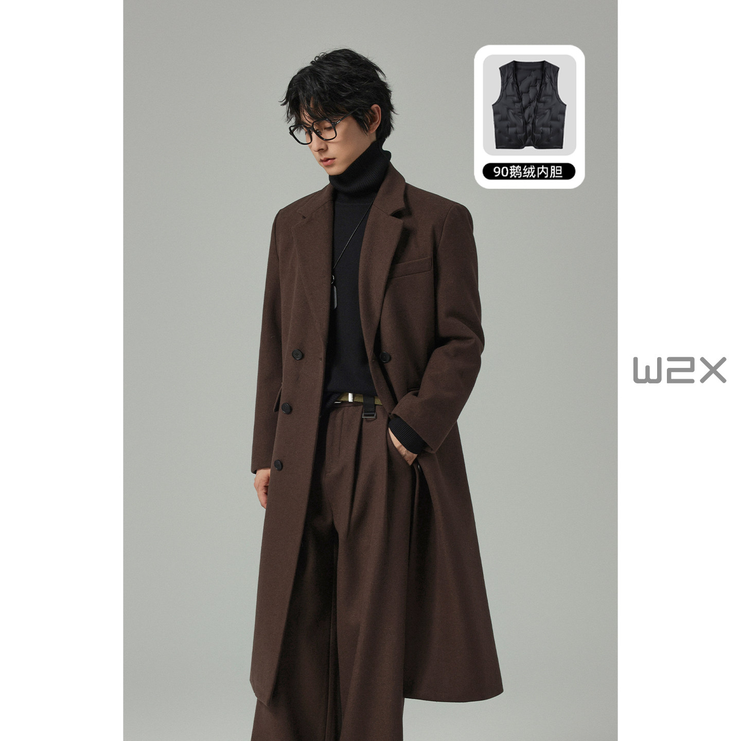 W2x winter wool wool coat with goose down liner men's long over the knee jacket old money style double-breasted trench coat