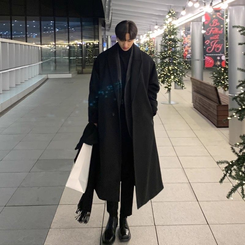 Winter new woolen coat men's long over the knee Korean version loose handsome woolen jacket men's British trench coat