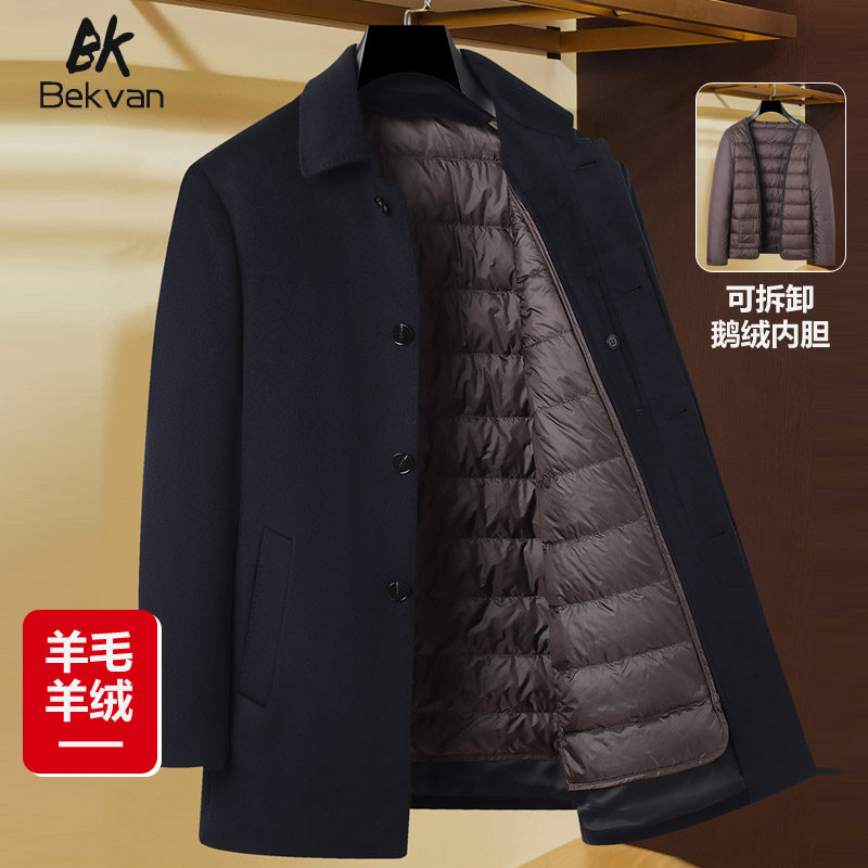 Cashmere coat, men's mid-length winter thickened goose down liner lapel wool jacket men's dad coat