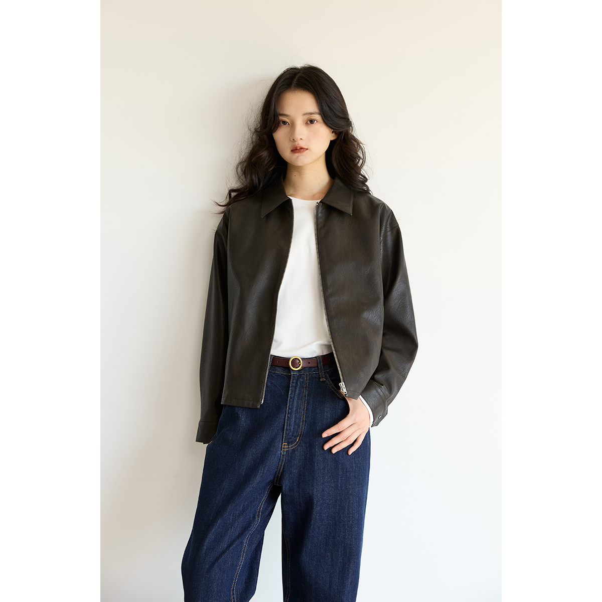 Xinlei Lin "Brook Block" vintage matte textured leather jacket women's silhouette jacket new for autumn and winter