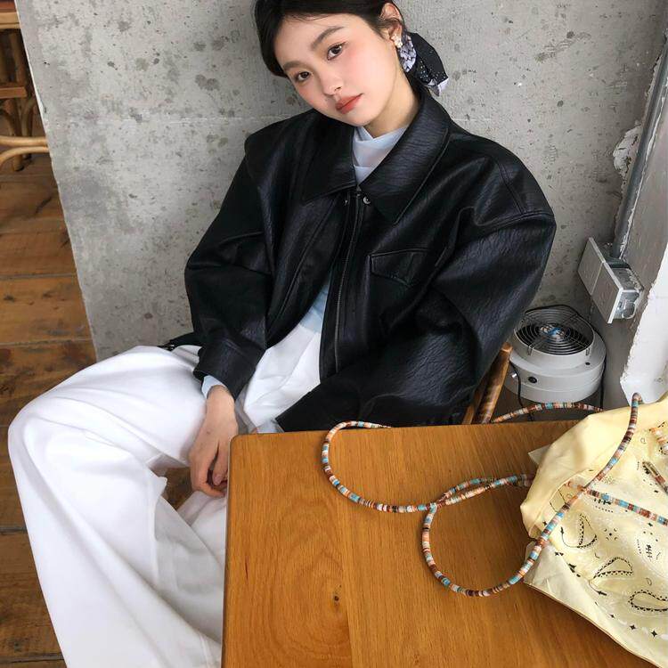 ICHMODE American Vintage Short Black Leather Jacket Women's 2026 New Spring Loose Leather Jacket Top
