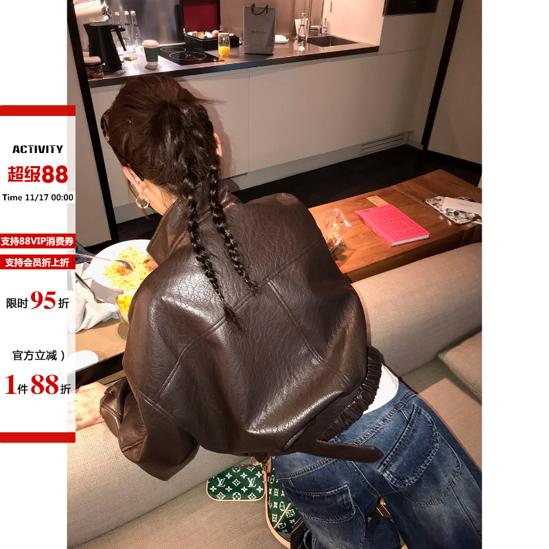 Aomalm Shaoye eyes "British time difference" % American cool style PU leather jacket women's winter loose jacket top