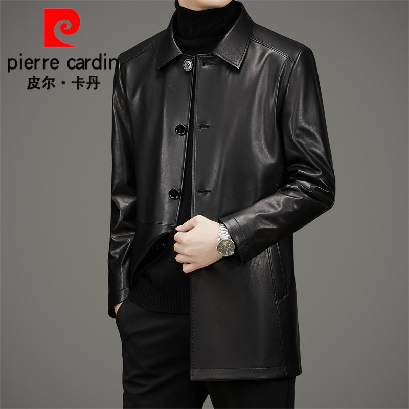 Pierre Cardin autumn top tire cowhide leather jacket men's mid-length trench coat lapel leather jacket jacket