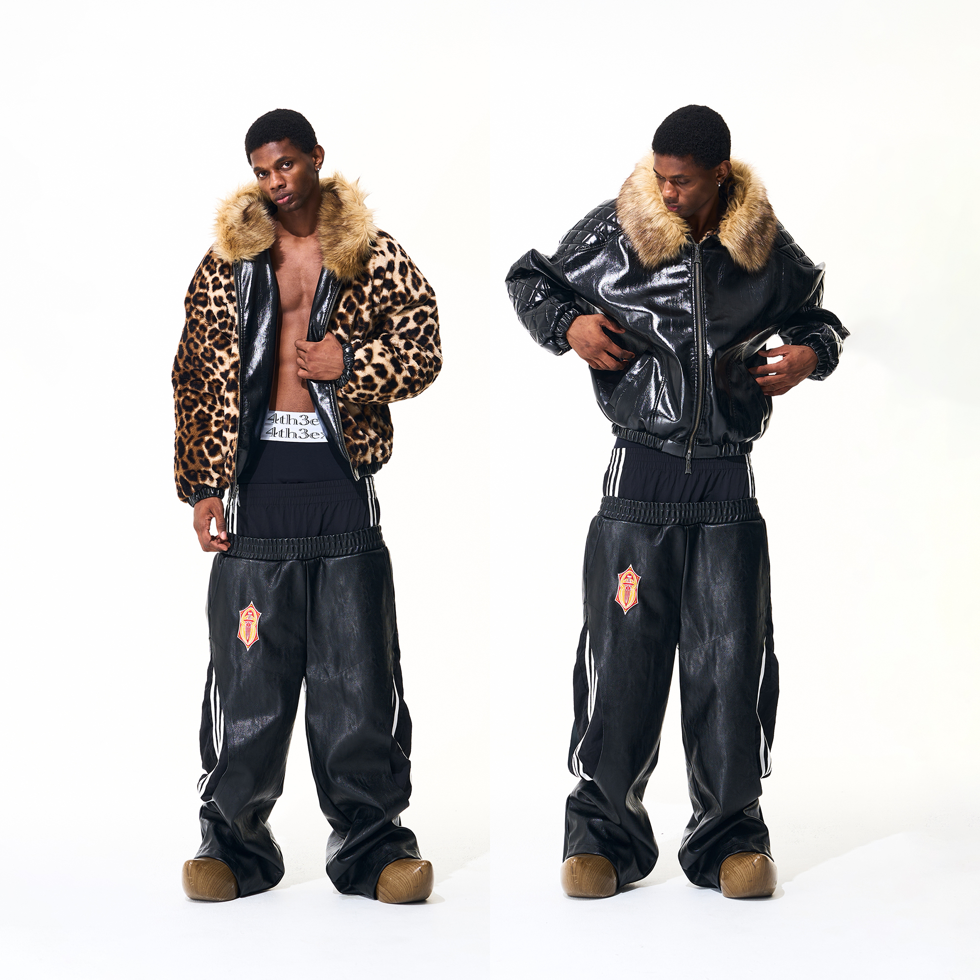Fourth3ex 25FW reversible diamond-patterned leopard print leather jacket men's winter fur collar fur jacket