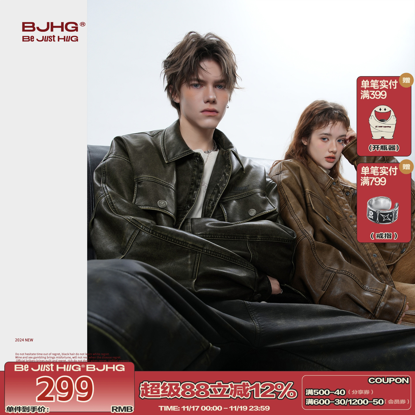 BJHG reckless Maillard leather jacket men's autumn and winter thickened trendy brand washed jacket thick jacket women