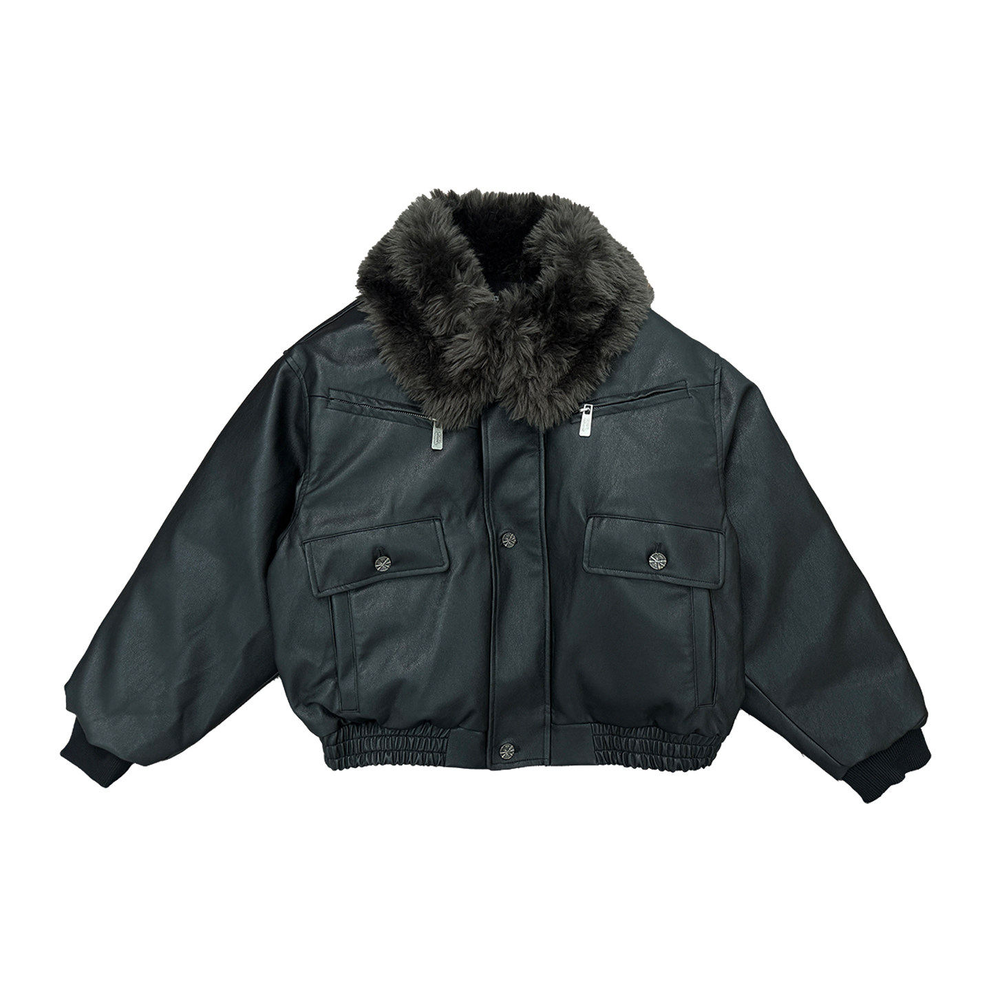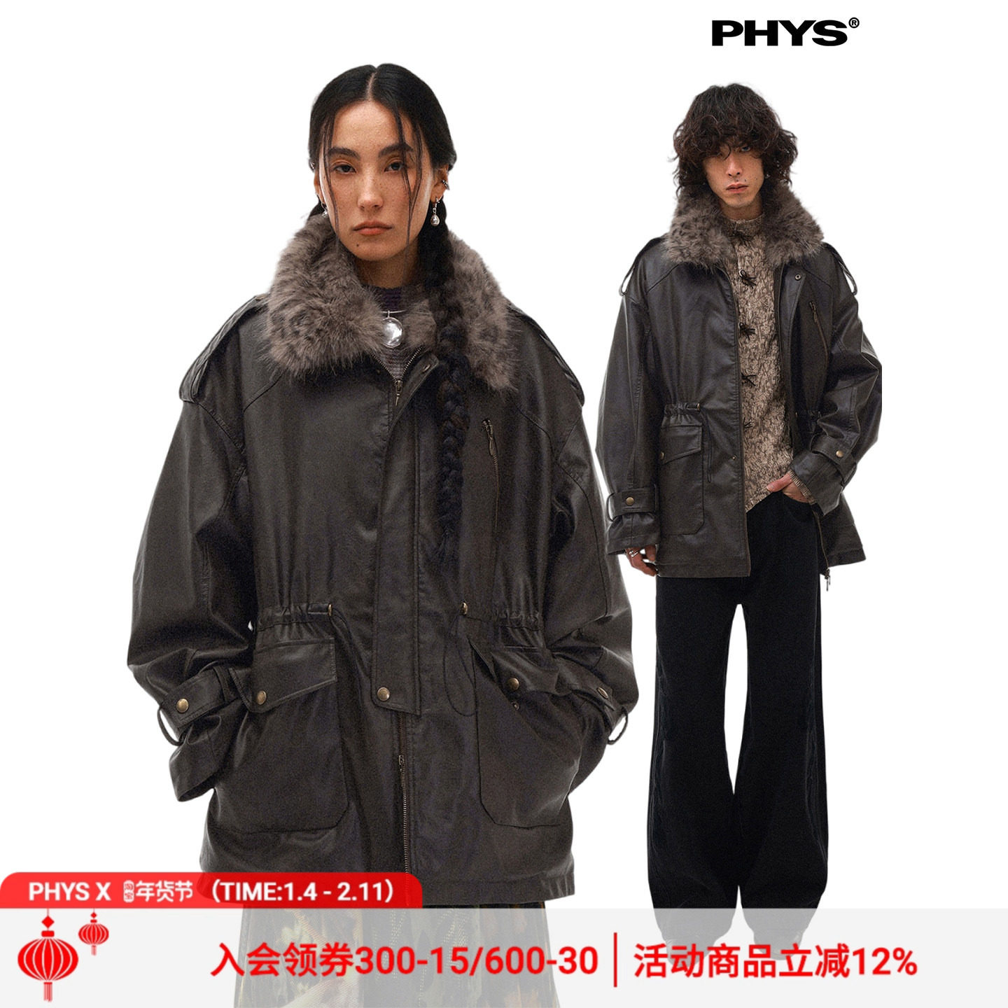 Physical Boy "Winter Rust Spot" detachable fur collar dropped shoulder mid-length quilted cotton warm and lazy PU leather jacket