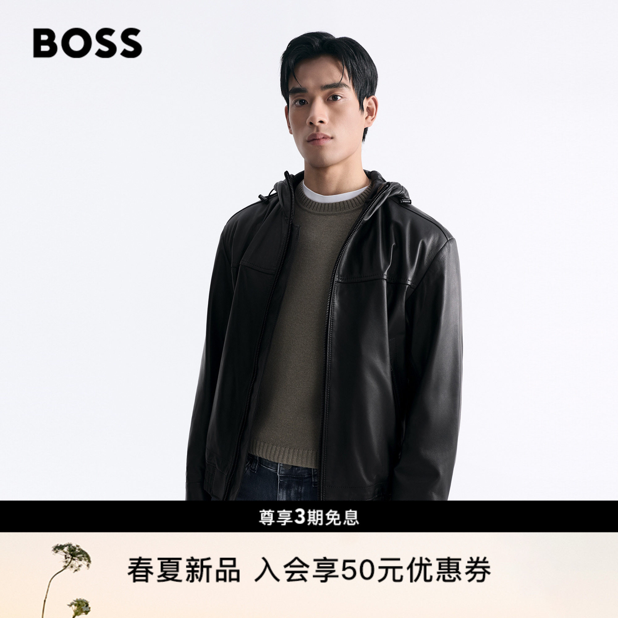 【Sheep Leather】BOSS Men's New Sheepskin Hooded Leather Jacket in the spring of 26
