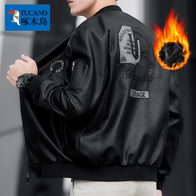 Woodpecker leather jacket men's spring and autumn loose fattened plus size youth trendy brand fat baseball collar jacket