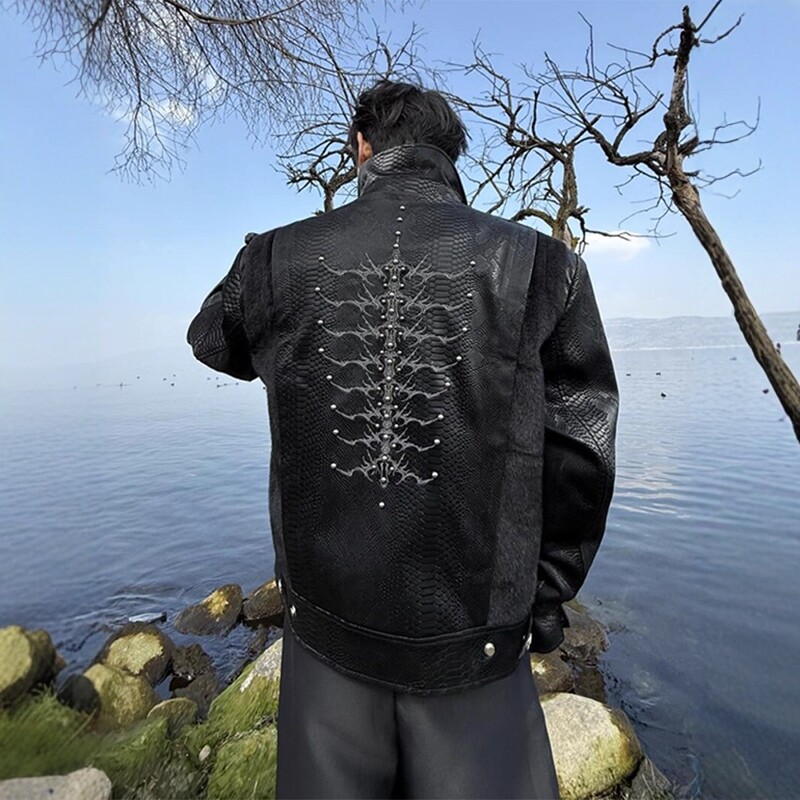 American fashion brand snake pupil spine niche pattern snakeskin patchwork jacket men's rivet embroidery PU leather jacket men