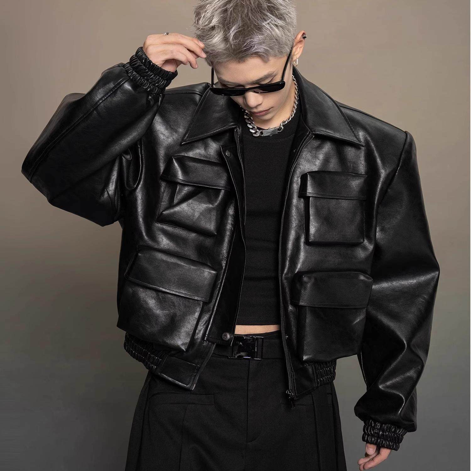 Black cropped leather jacket men's cleanfit American fried street bike suit silhouette wide-shoulder riveted cargo jacket