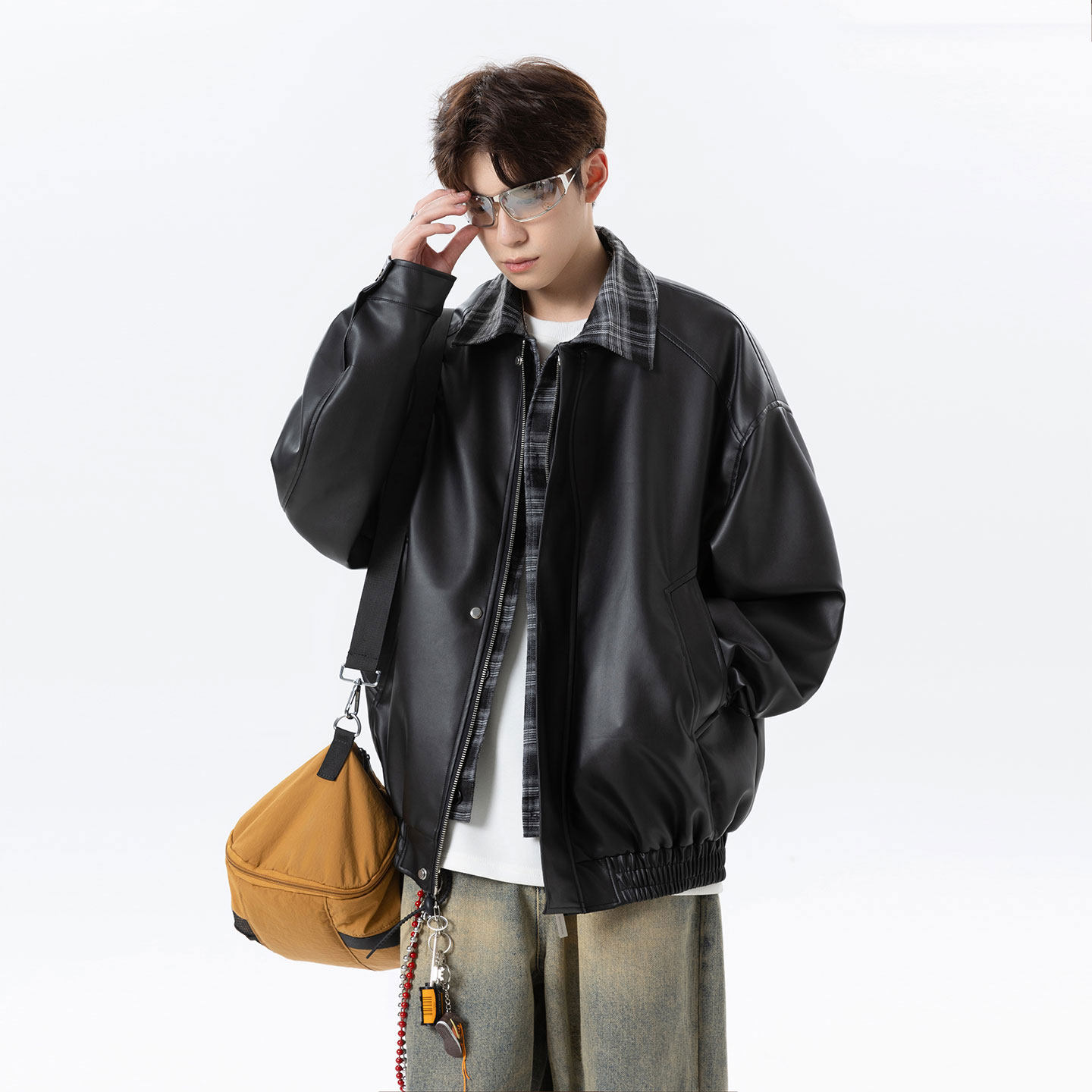 Fake two-piece plaid spliced lapel leather jacket men's spring and autumn 2026 new American high street trendy brand ruffian handsome overalls