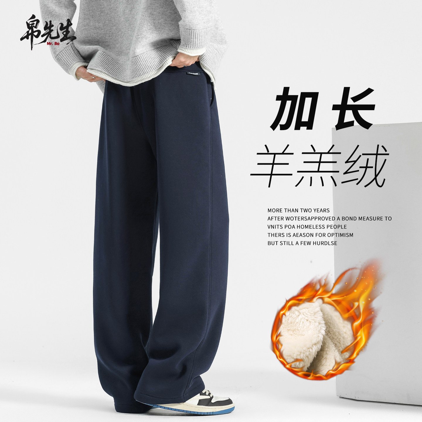 Mr. Bo elongated lambswool men's pants, winter fleece thickened wrinkle-resistant straight pants, slacks, wide-leg sweatpants