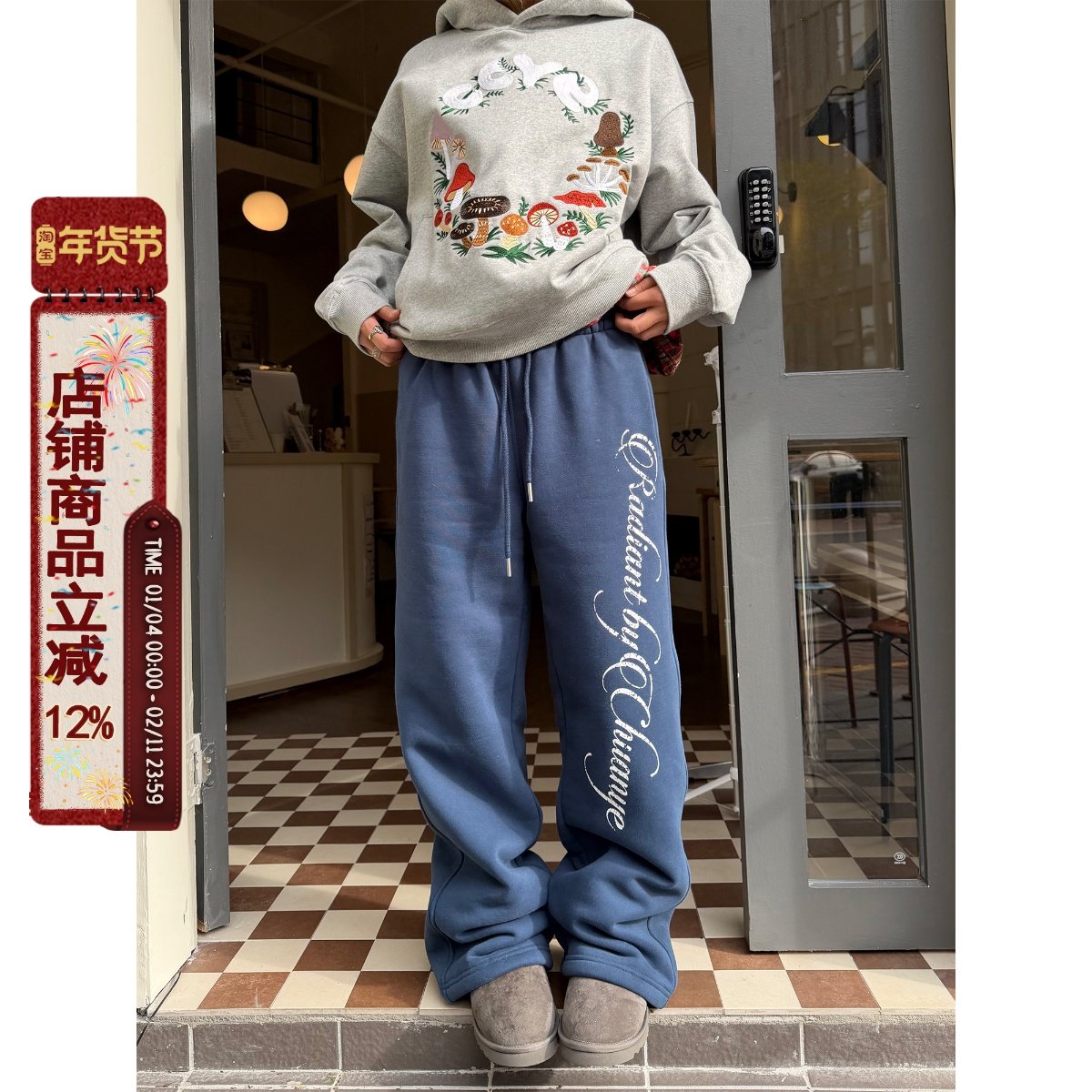 Chuanchuan also original printed integrated velvet sweatpants ties for men and women, American autumn and winter warm heavy elastic waist slacks