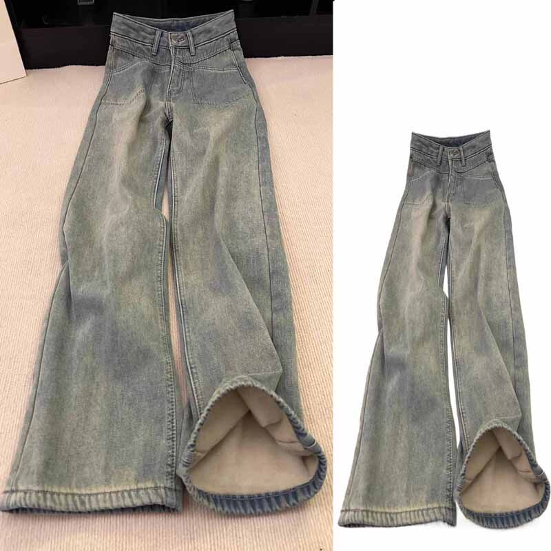 Fleece thickened loose straight jeans women's autumn and winter new retro washed design high-waisted slimming wide-leg pants