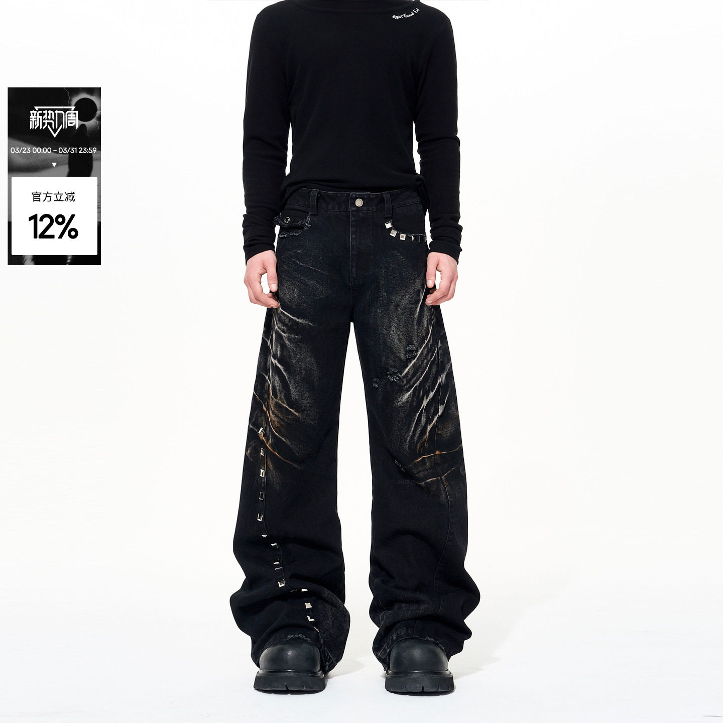 SEE [Lei Songran same style] retro washed old cat beard jeans men's autumn and winter rivet design wide-leg pants