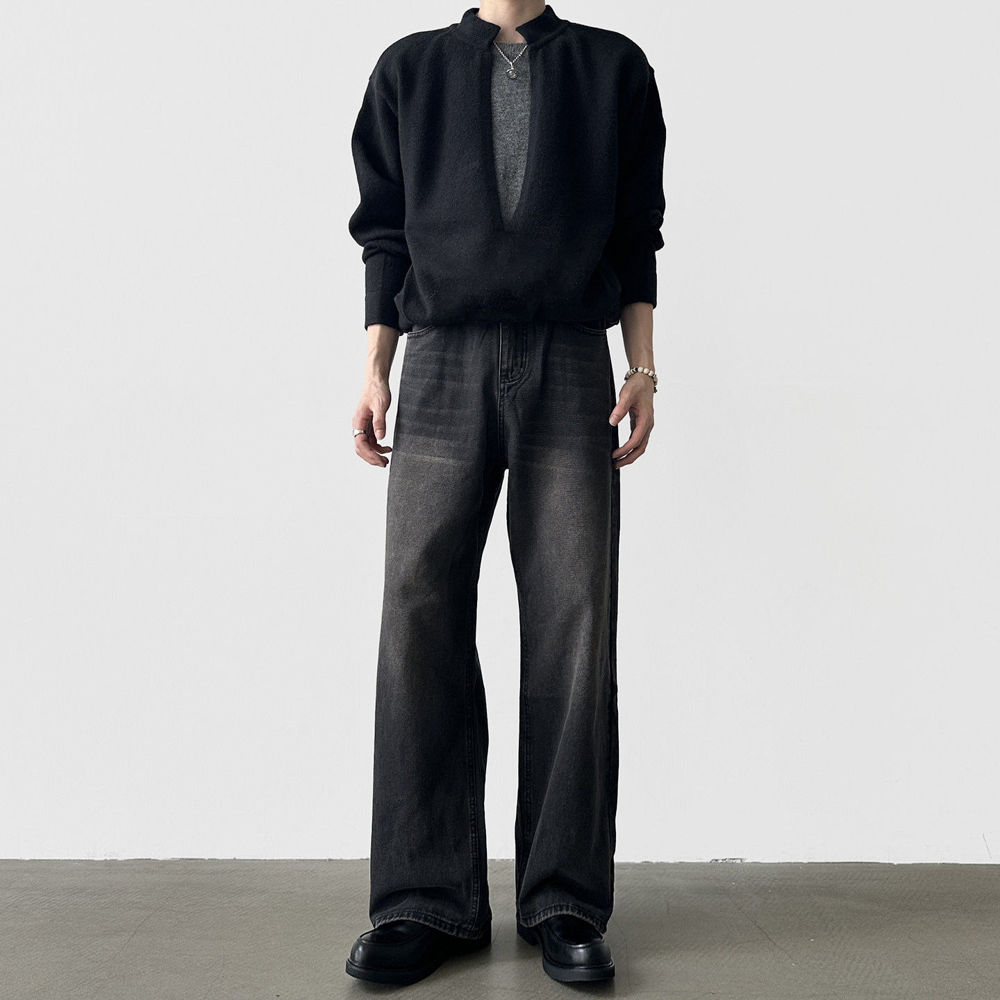 A6 studio Autumn and Winter Washed Black and Grey Vintage Jeans Men's Straight Loose Drape A-Line Wide-Leg Jeans