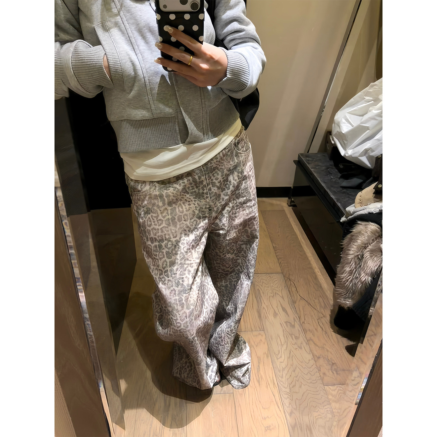 F383 American Vintage Washed Distressed Leopard Print Jeans Men's and Women's Trendy Brand Loose Straight Casual Slimming Pants