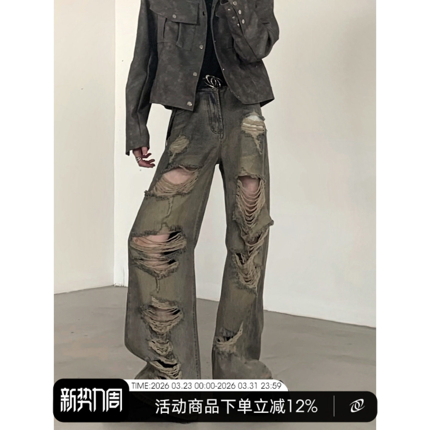 Autumn mountain wind/wasteland old washed high street ripped jeans men's wide-leg niche design beggar pants