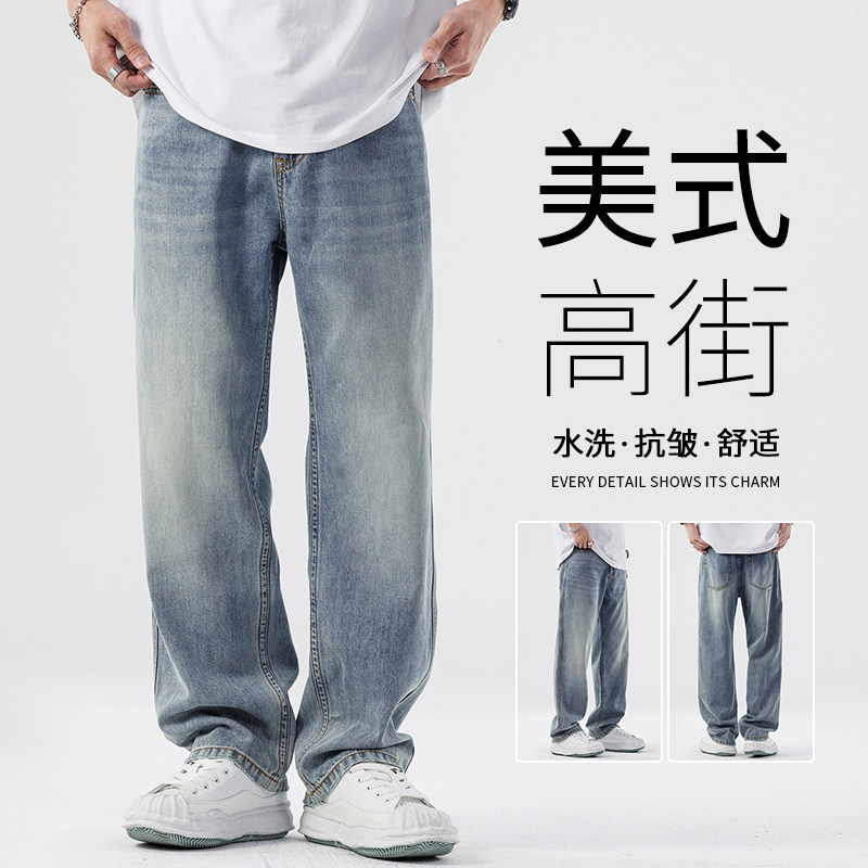 Pull-back jeans men's spring 2026 new American retro straight leg loose wide-leg men's casual trousers