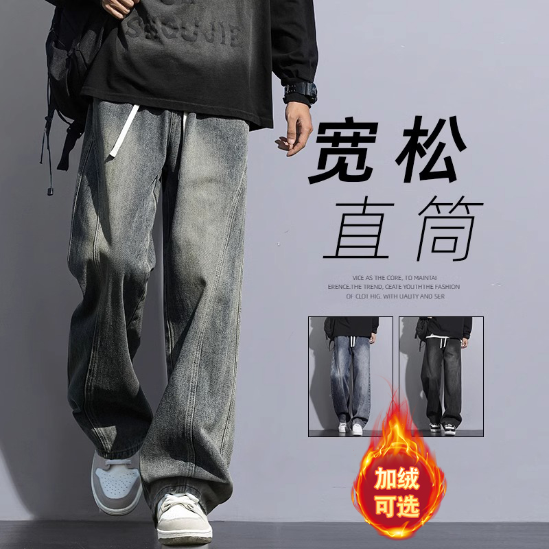 American high street wide-leg jeans men's autumn loose straight casual trousers floor-length pants boys plush retro