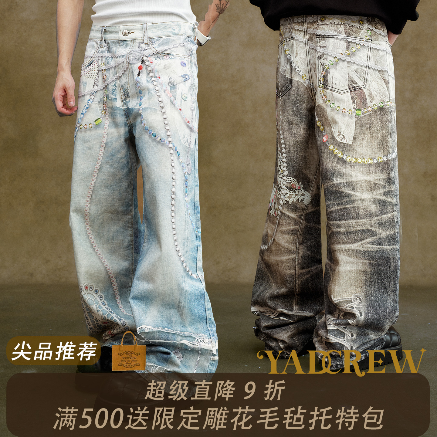 Qiao Jingwen X Fu Longfei X Chen He X Huang Shuo same style] American lace color bead chain printed denim straight-leg pants