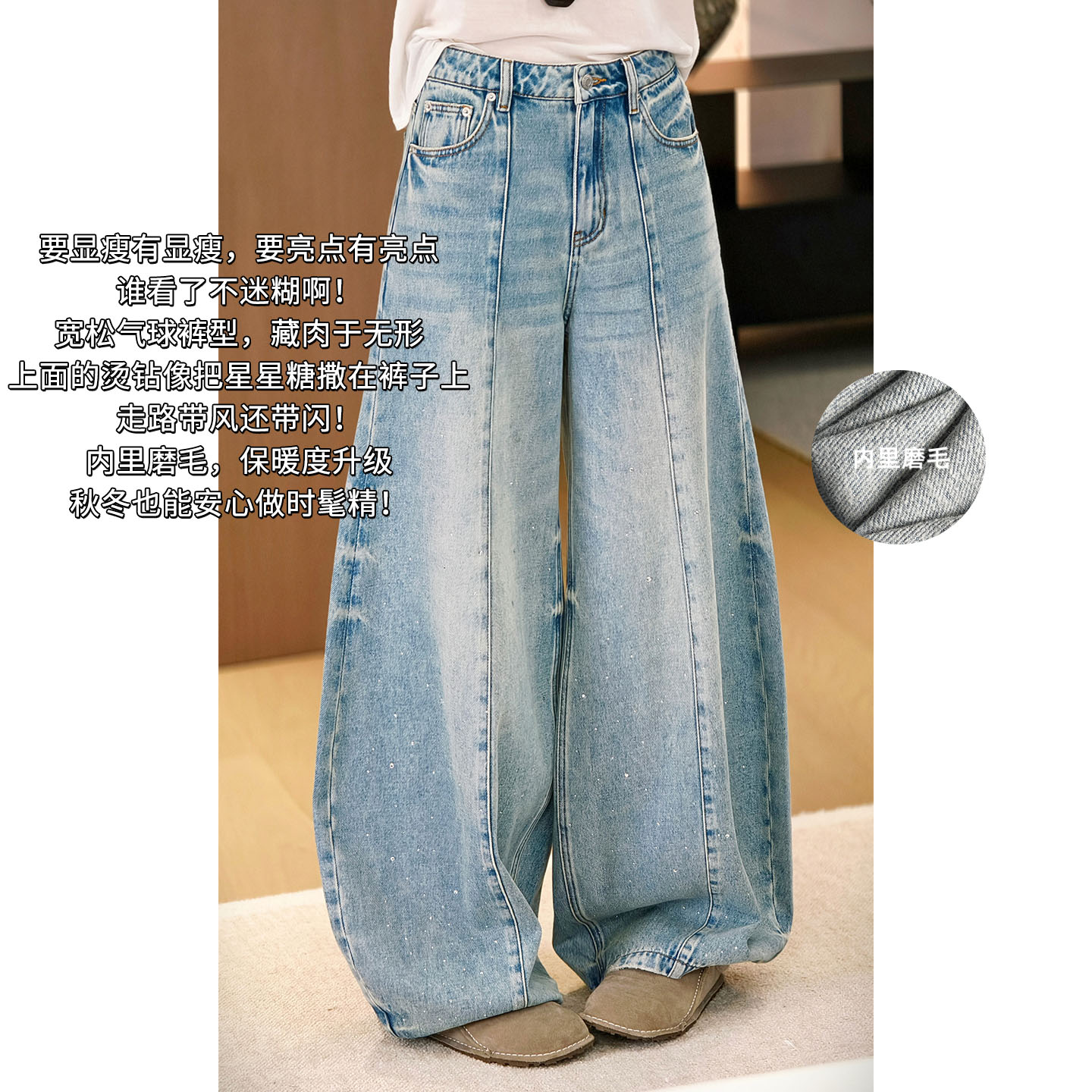 MEIYANG Star Sugar Jeans Brushed Warm Hot Diamond Loose Balloon Pants [Small 60] - Friday