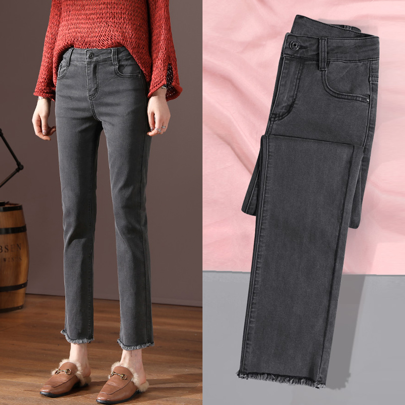 Smoke gray straight-leg jeans for women with fleece in autumn and winter, high-waisted vintage raw edge, cropped pipe pants