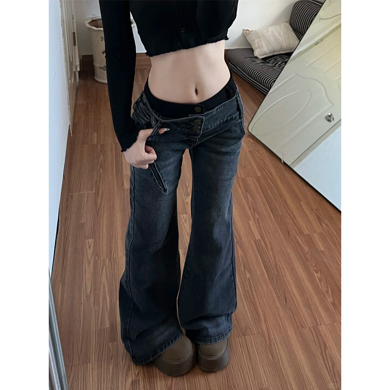 Black and gray bootcut jeans, women's spring and autumn, American high street design, low-waisted, slim, slender, hot girl, wide-leg flared pants