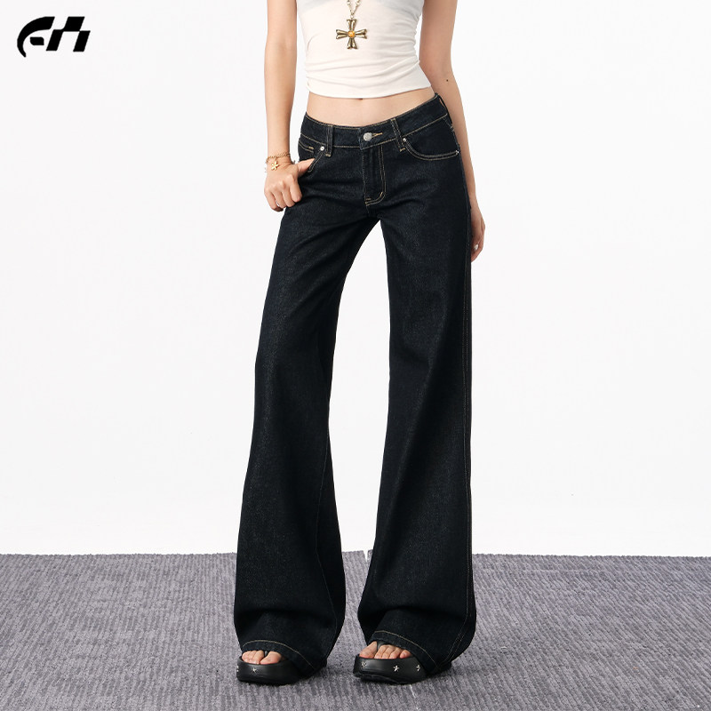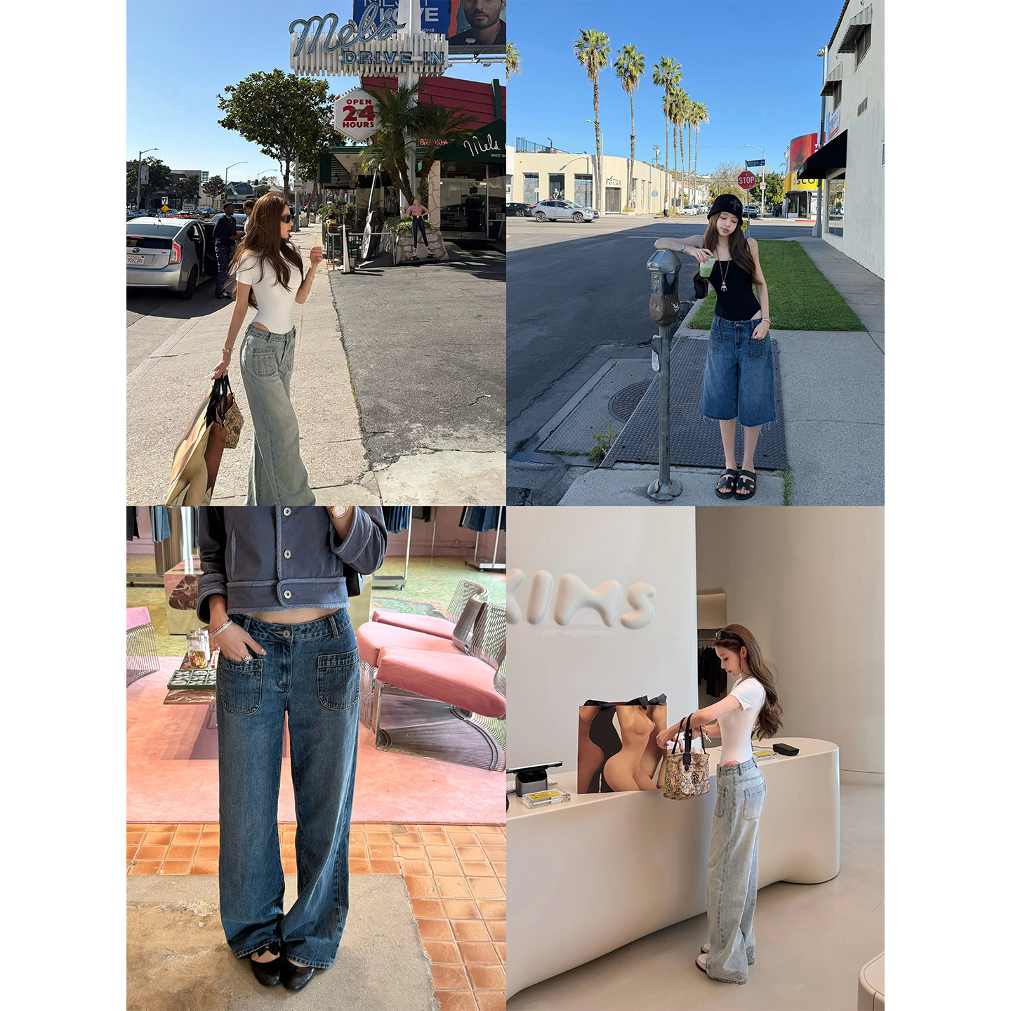 Good morning Fan Fan "Fengshen Low Waist" super waist-to-hip ratio pocket line loose denim trousers + denim pants