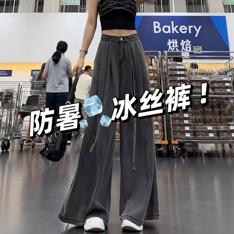 Lyocell Tencel jeans women's pants summer thin small elastic waist straight loose ice silk wide-leg pants