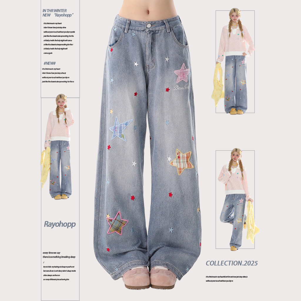 Rayohopp Star Application Jeans Women's Autumn and Winter New Pants with Fleece and Thickening Loose Versatile Wide-Leg Pants