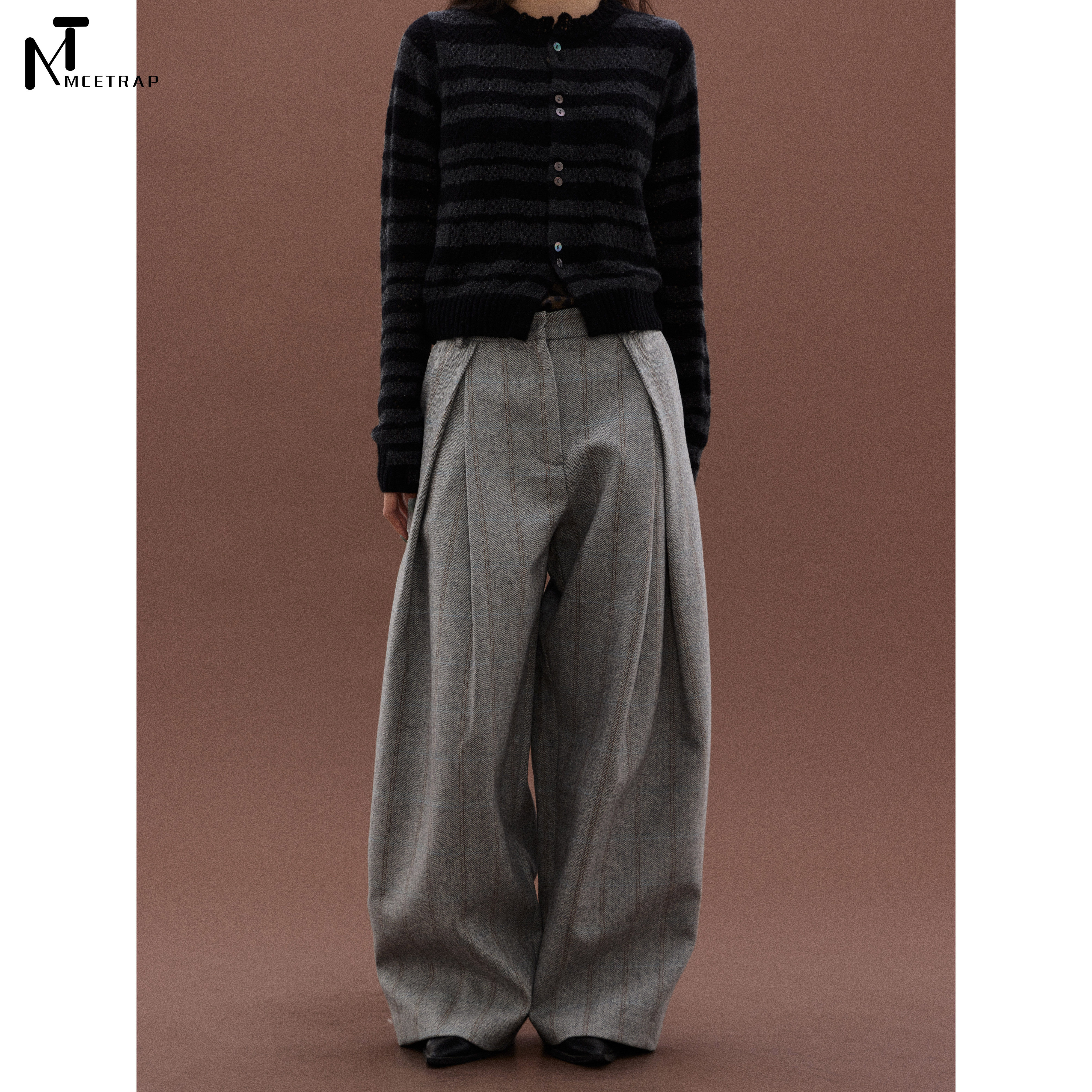Mcetrap(MT) Winter heavy vintage herringbone wool pressed double-pleated trousers, high-waisted wide-leg slacks, women