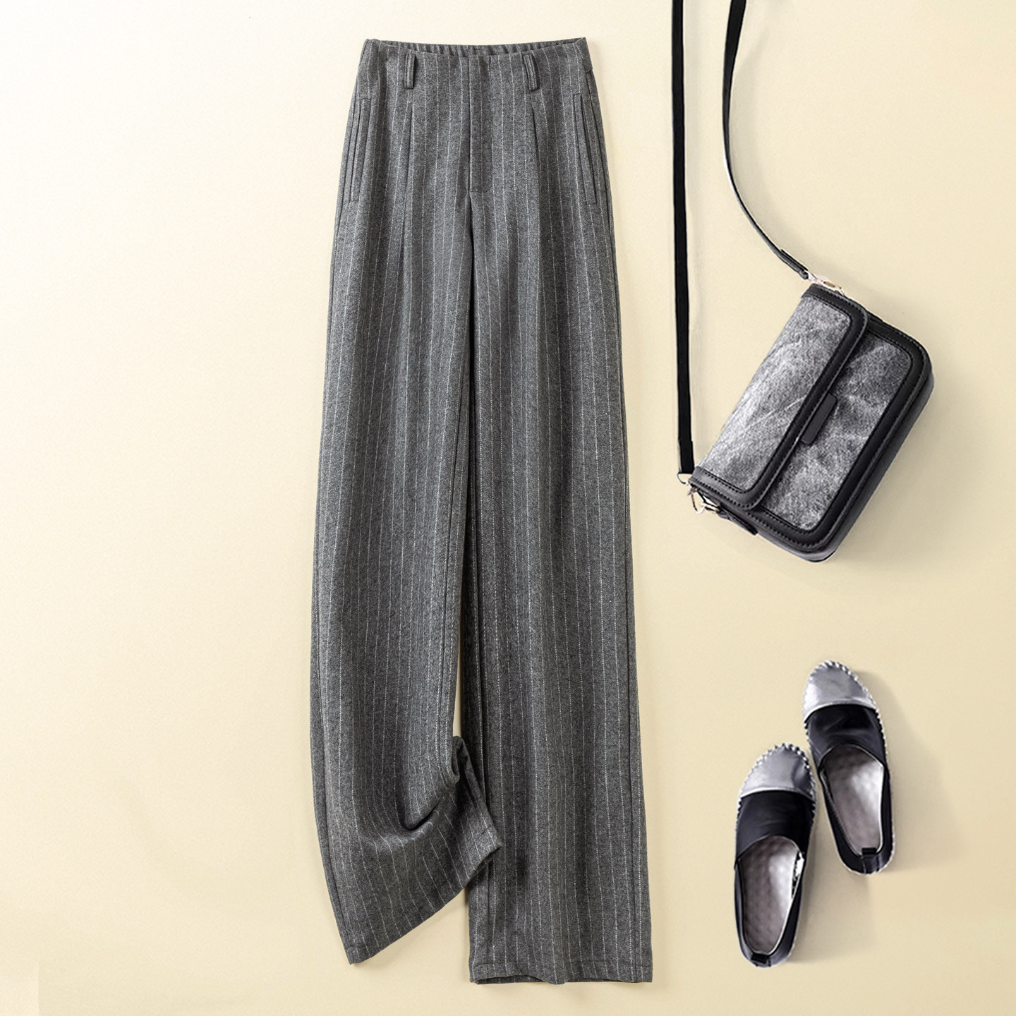 50% wool gray vertical stripe woolen wide-leg pants women's 2025 autumn/winter new pants high-waisted straight-leg suit pants