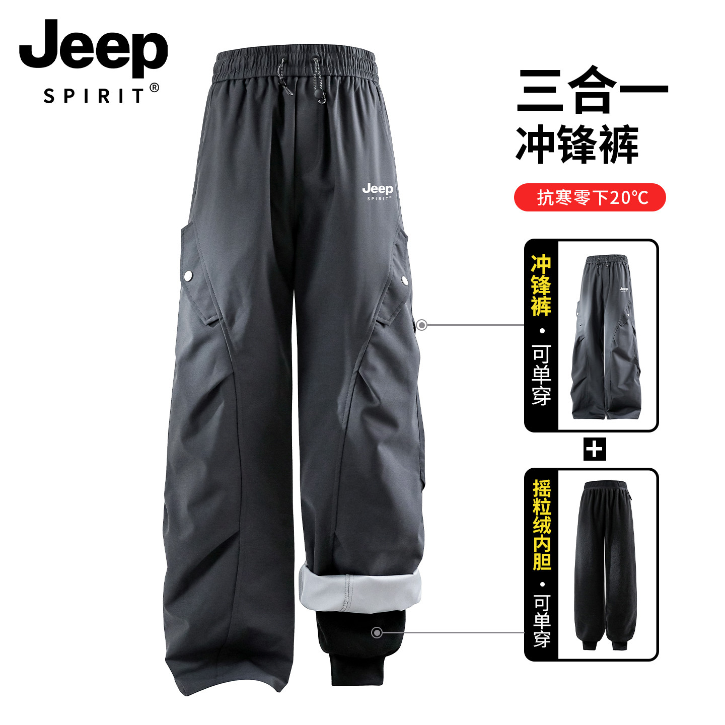 JEEP Softshell Assault Pants Men's 3-in-1 Windproof and Coldproof Mountaineering Plus Size Thickened Plus-Fluffed Ski Down Cargo Pants