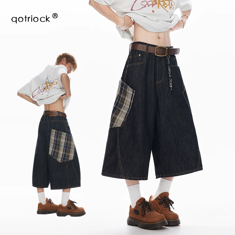 American denim plaid large pocket scimitar cropped pants for men and women 2025 summer trendy brand casual shorts wide-leg mids