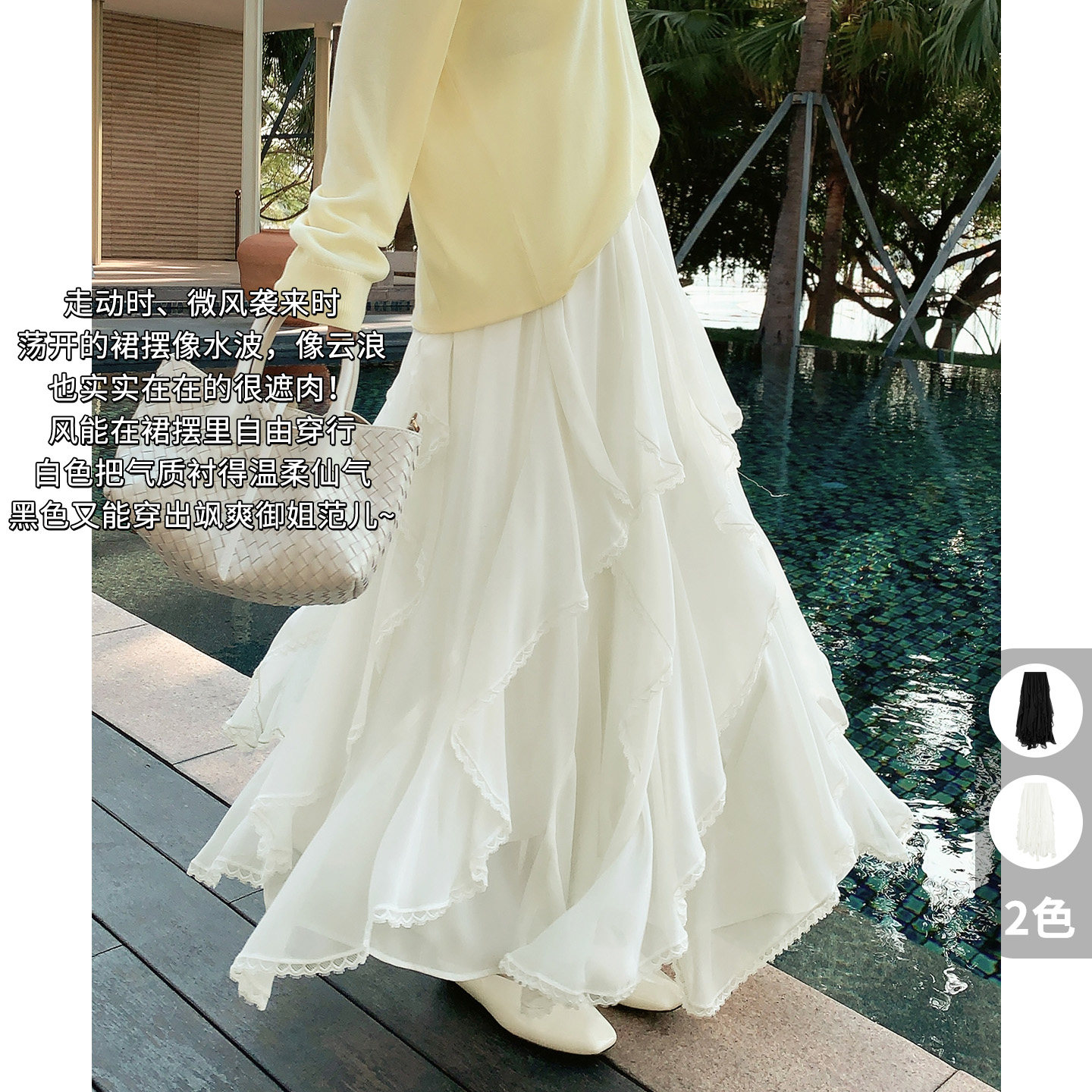 MEIYANG Evening Breeze Walking Skirt Chiffon Yarn_Fairy Ruffled Black and White Fairy Skirt - Monday