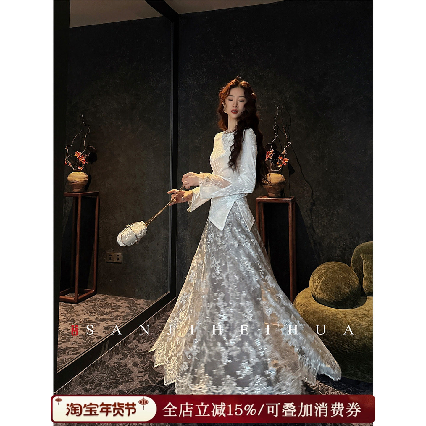 Sanji Heihua [Fuguang] New Chinese beaded embroidered velvet winter skirt 2025 new lace mesh