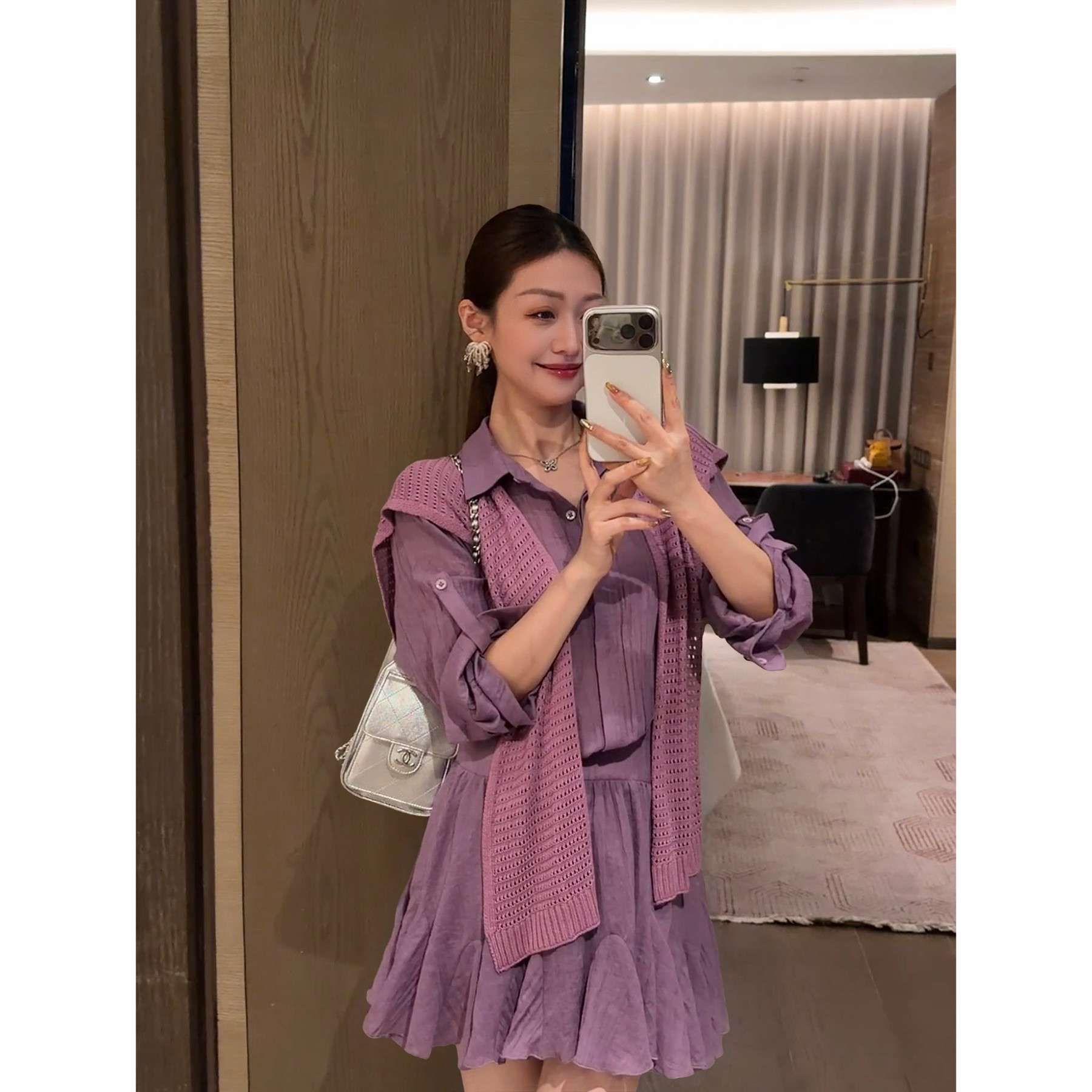 Wang Haha [In the Mood for Love] 26 Spring New Casual French Pleated Lapel Purple Shirt Dress