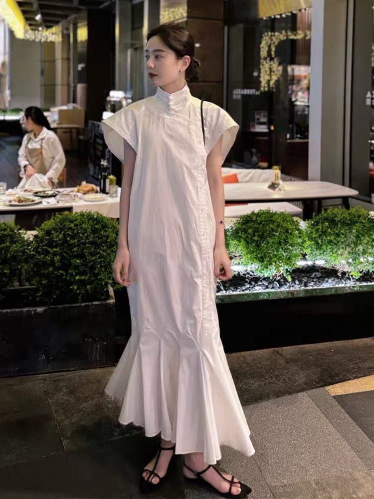 New Chinese white buttoned shirt dress women's 2025 summer new temperament high-end high-collar national style long skirt