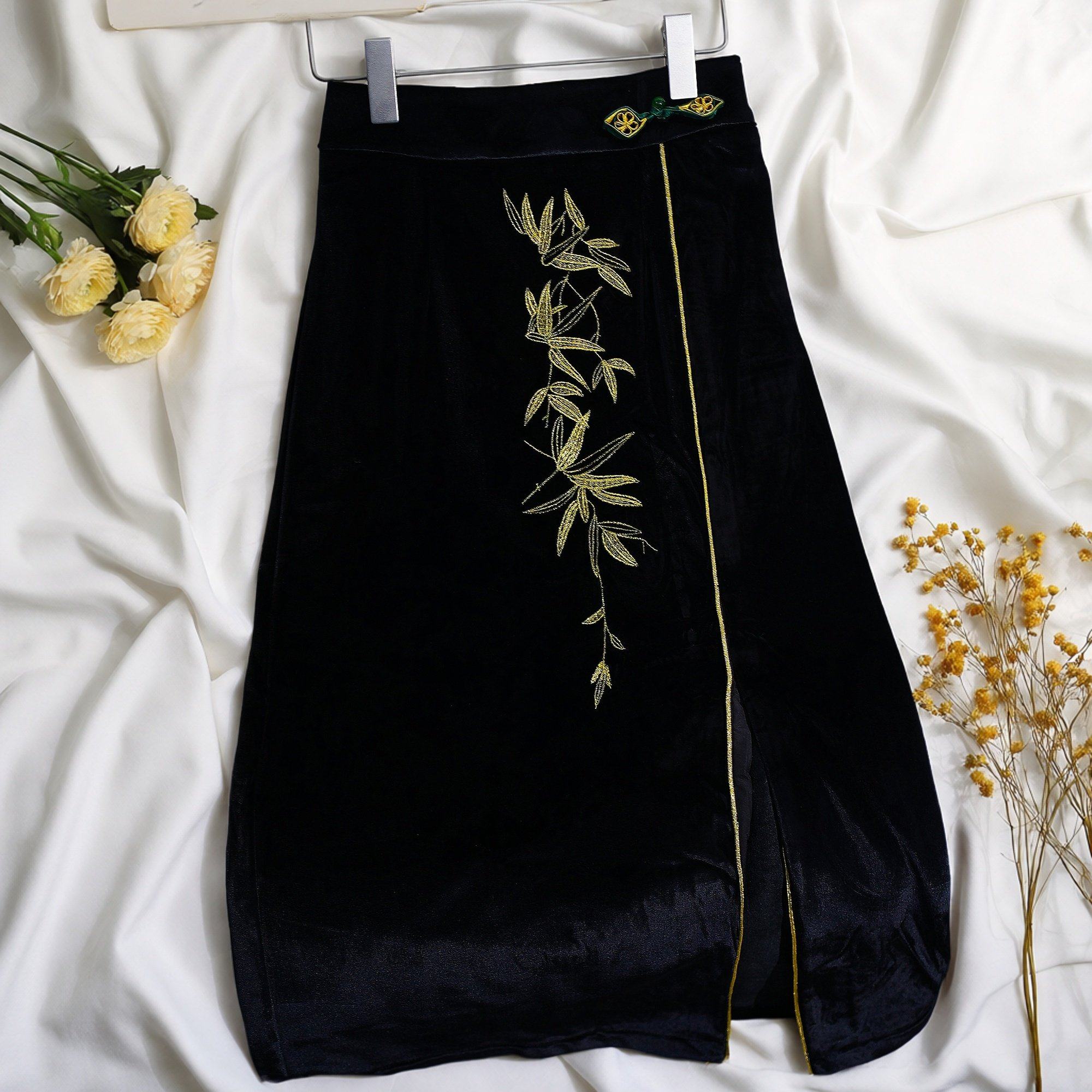 New Chinese style black velvet embroidered skirt women's retro gold thread slit mid-length old money style
