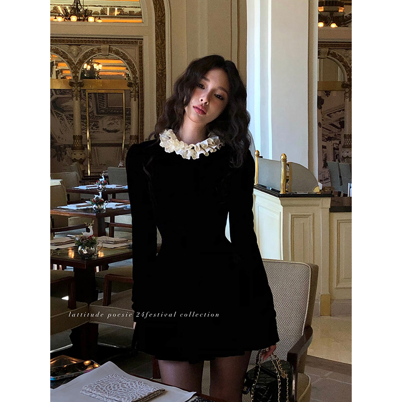 Lattitude Yang Xiaolu Miss Di*r Vintage lace collar velvet French long-sleeved dress woman