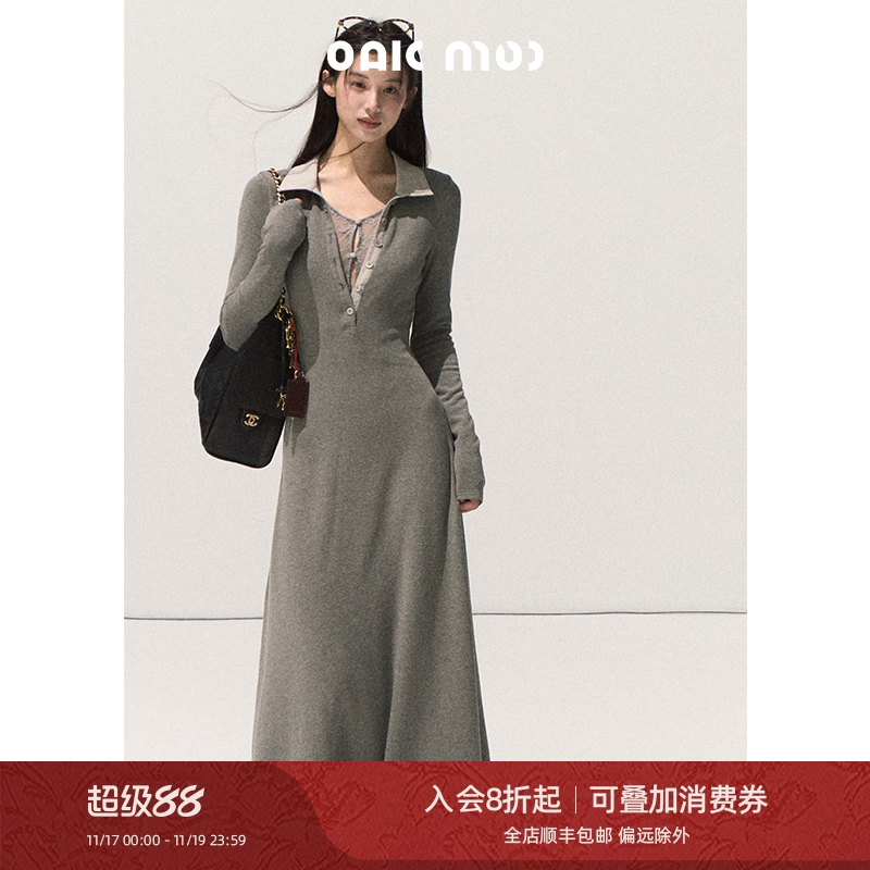 OAKMOO/"Misty Breath" Plush shirt collar fake two long-sleeved knitted dresses with a cinched waist skirt